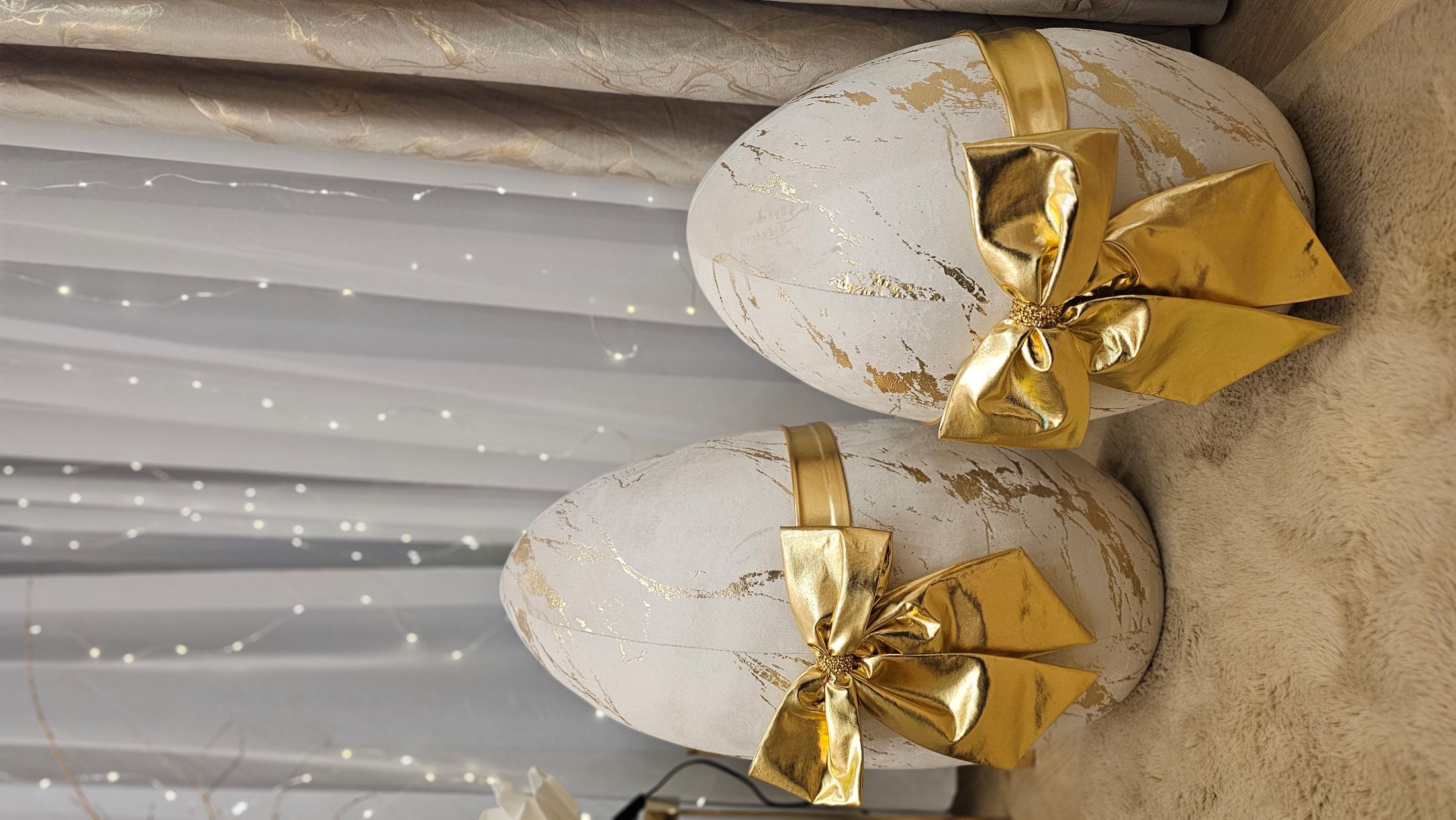 Jajo Wielkanocne - dekoracja stojąca. Wysokość 50cm.Materiał velvet krem marmur ze złotem. Ozdobna kokarda z tkaniny lama, kolor złoty.