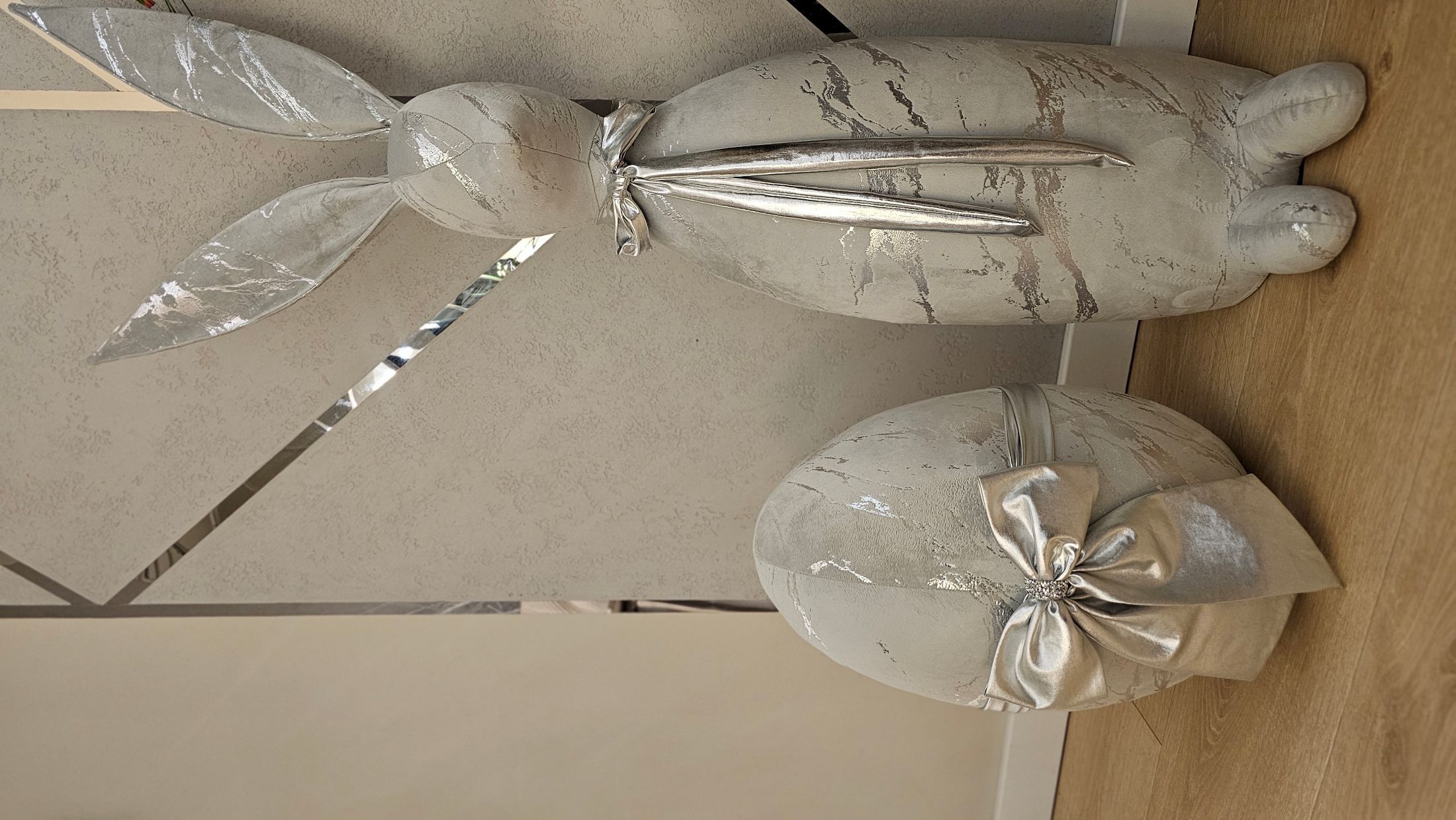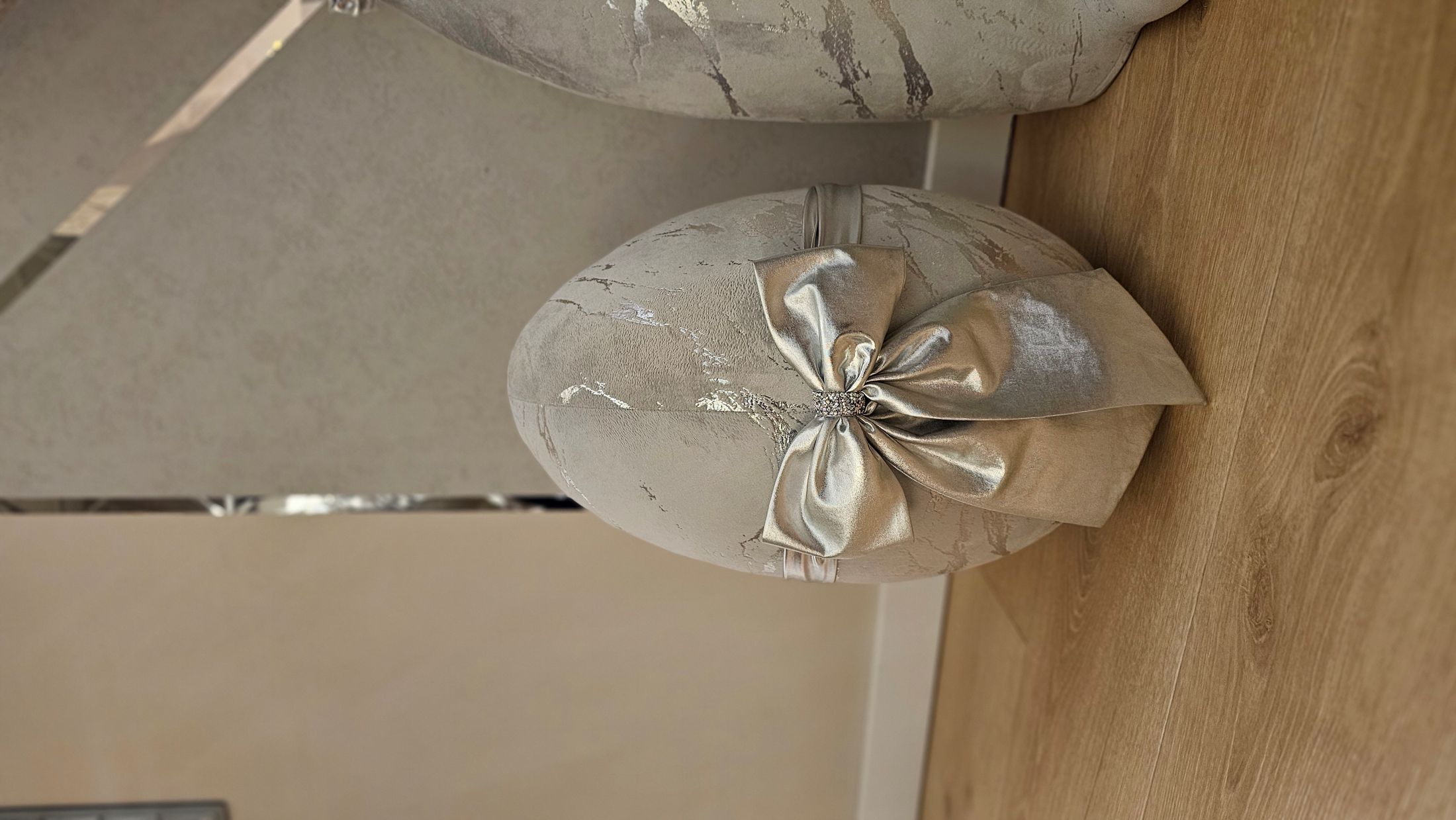 Materiał velvet szary marmur ze srebrem. Ozdobna kokarda z tkaniny lama, kolor srebrny.