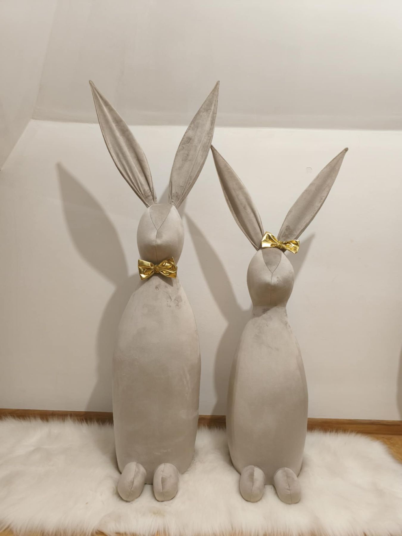 Zając stojący 110cm kolor krem velvet. Kokarda lama błyszcząca złota doczepiona do ucha. Figura robiona od podstaw przez krawcowa.